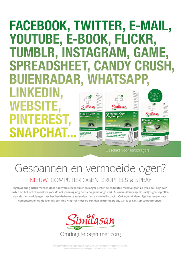 SIMILASAN CAMPAGNE Similasan is een Zwitserse producent van diverse zelfzorgproducten. Na een aantal jaren van het toneel te zijn verdwenen zijn de producten voor oogverzorging van Similasan weer terug op de Nederlandse markt. Met een nieuw verpakkingsontwerp en een nieuwe campagne.