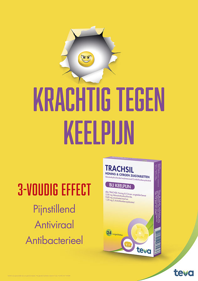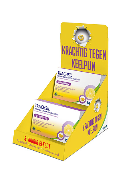 INTRODUCTIECAMPAGNE TRACHSIL In opdracht van Teva Nederland hebben we voor TrachSil, de nieuwe honing en citroenzuigtabletten tegen keelpijn, de introductiecampagne vormgegeven. Deze bestaat onder andere uit een kleine kassadisplay, raamstickers en posters voor in de apotheek. Daarnaast hebben we ook een Instagram advertentiecampagne uitgerold waarin de krachtige tablet de actieve hoofdrol speelt.