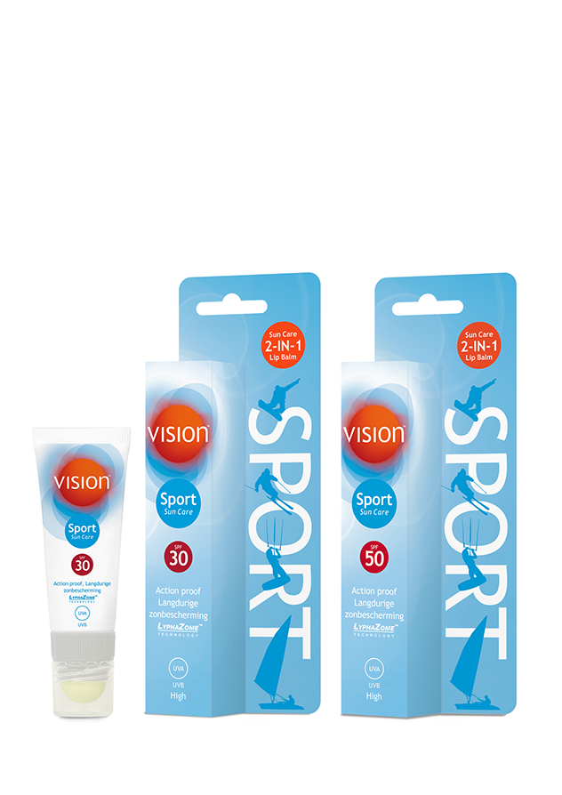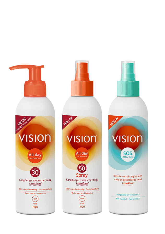 VERPAKKINGONTWERP VISION Vision Sun is een productlijn met diverse zonbeschermingsproducten. De nieuwe verpakkingen hebben een duidelijke branding en zijn modern en fris in hun verschijning. De lijn bevat diverse SPF's, diverse verpakkingsvormen, maar ook speciale producten voor kinderen en voor sportieve momenten. Sinds de introductie van de nieuwe verpakkingslijn is Vision Sun inmiddels het meest verkochte zonbeschermingsproduct in Nederland.